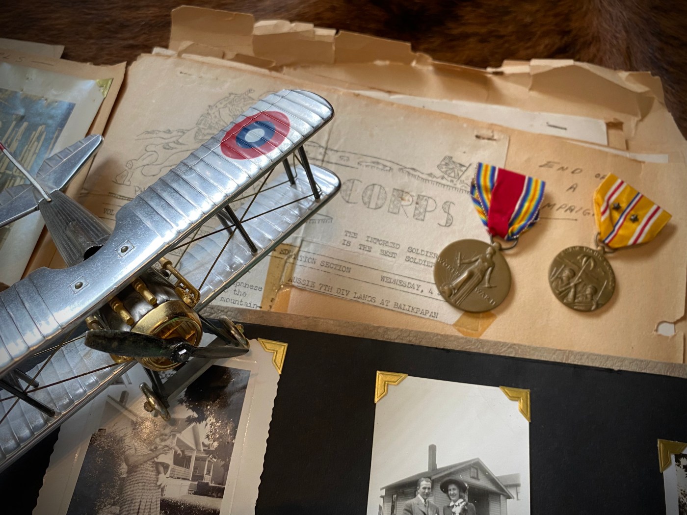Now I have boxes of these heirlooms that were once so rare to possess: World War II journals from Grandad that I hope to transcribe, describing his time in the Pacific; Pop’s aluminum hard hat from his work on the Manhattan Project; a metal biplane model that I had longed to play with as a child but always sat high on a shelf in Pop’s office.